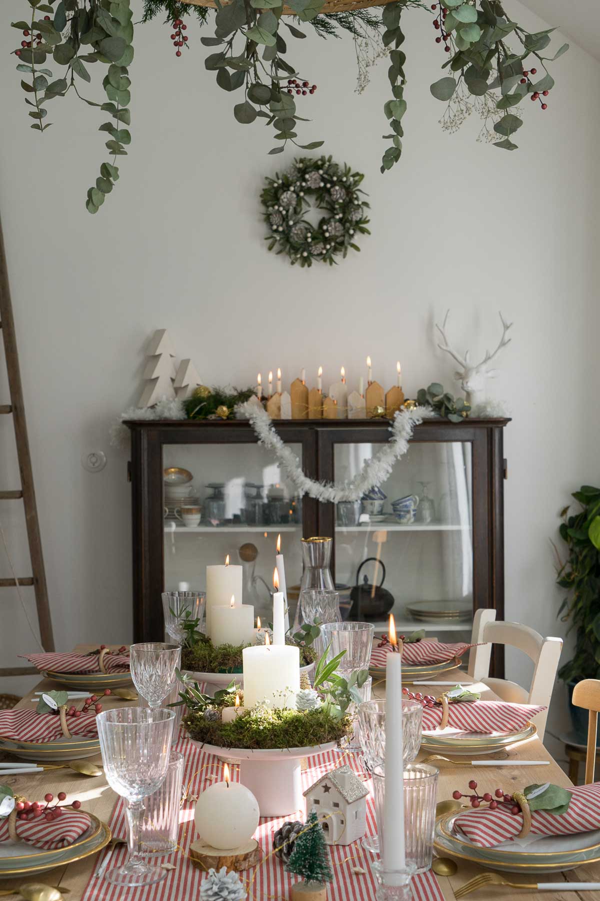 L‘eucalyptus, avec sa jolie couleur givrée et ses branches aériennes, est mon branchage favori pour la déco de Noël. Et puis il sent divinement bon ! Je l’ai utilisé dans mes ronds de serviettes, mais aussi en couronne accrochée au mur et surtout en suspension au dessus de la table. Pour ajouter un peu de contraste, je lui ai associé quelques branches de sapin ainsi que de la mousse. (Je vous détaille ces 3 DIY dans la suite de l’article :)) Des petits sapins artificiels viennent également décorer la table.