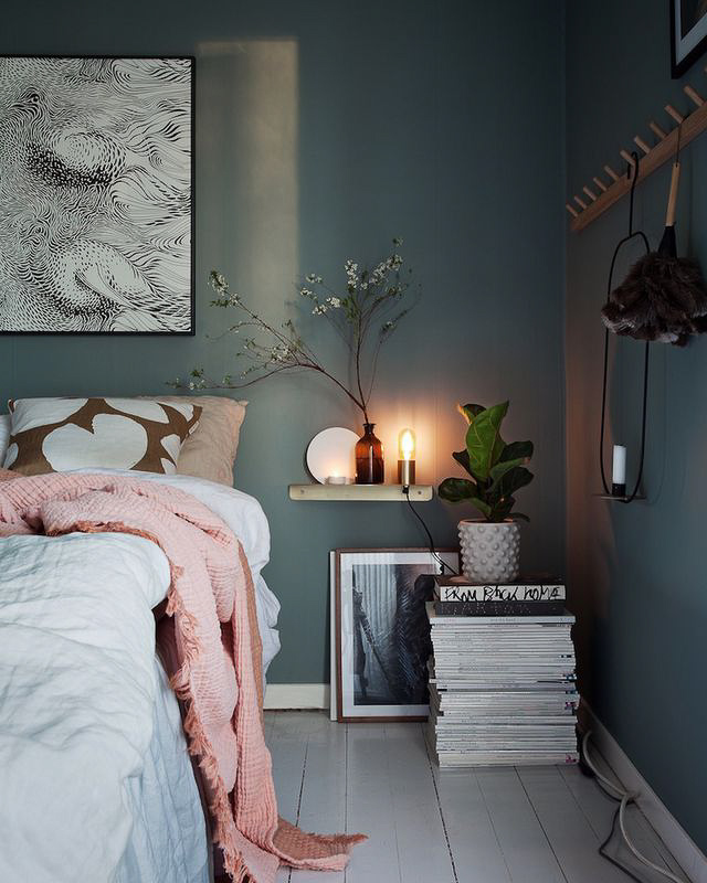 Associé à une teinte plus chaude comme le vert sur les murs, un plaid rose, des coussins colorés et des belles matières et c’est gagné à coup sûr !