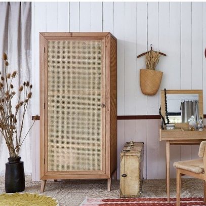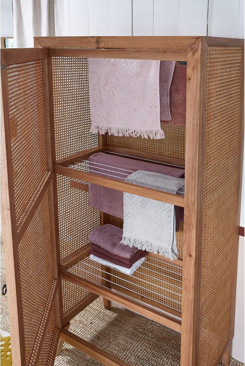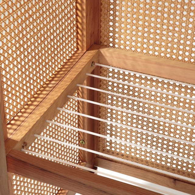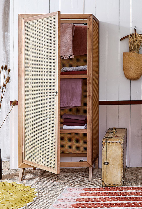 Intemporelle, la chambre de Billie Blanket nous enveloppe de ses tonalités chaudes, comme un cocon chaleureux et rassurant. Mais, loin de se reposer sur les lauriers du passé, elle est aussi inventive et créative : en témoigne cette lingère en cannage, la pièce phare de la collection selon moi. Faire enfin sécher son linge avec discrétion et style, une idée géniale qui vous séduira tout autant que moi j’en suis sûre ! En effet, si, au premier abord, la lingère ressemble ainsi à une jolie armoire cannée, on trouve à l’intérieur un système ingénieux d’étagères cordes à linge pour l’étendre à l’abri des regards.