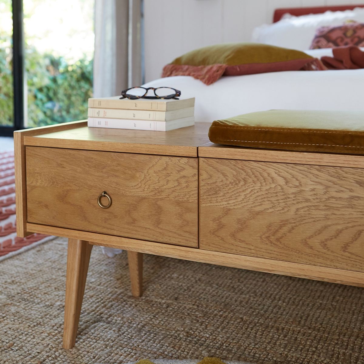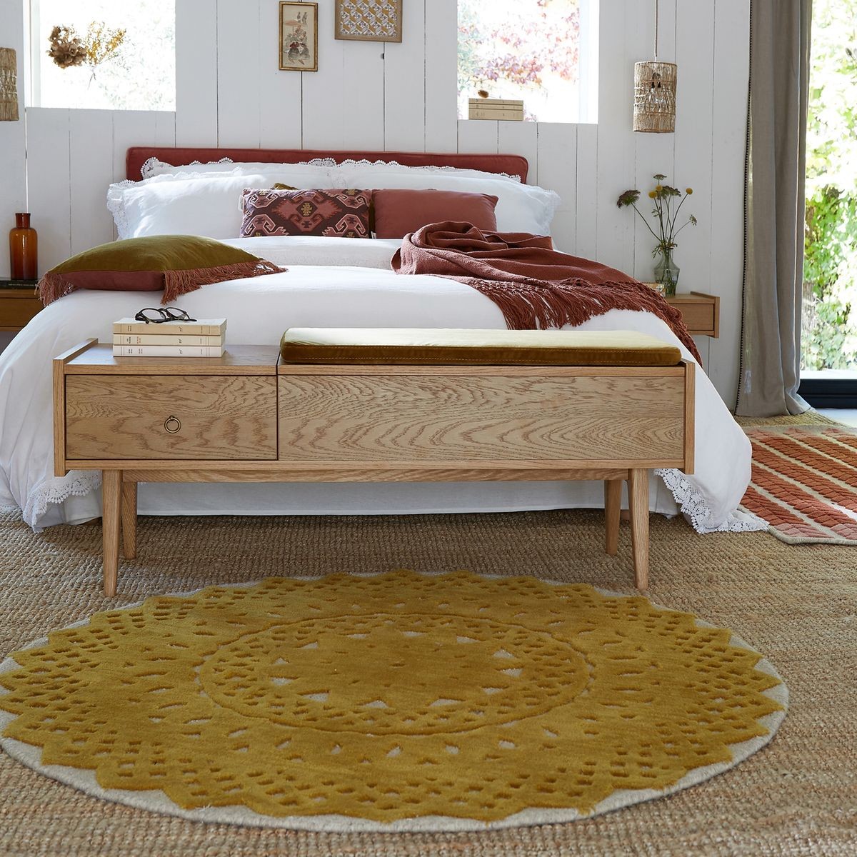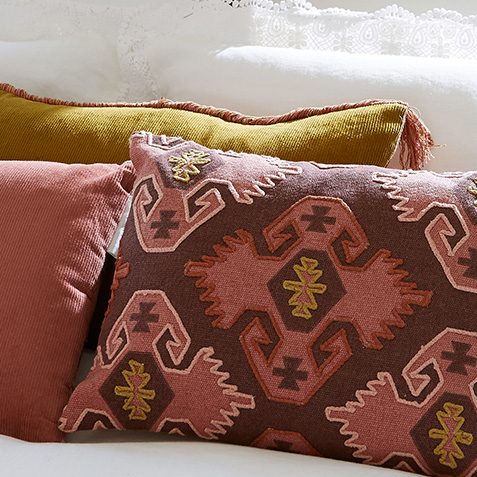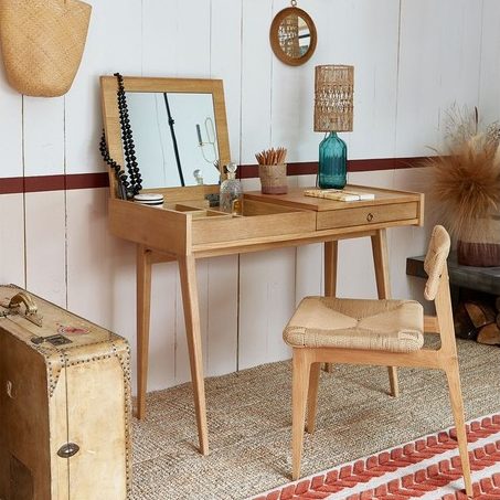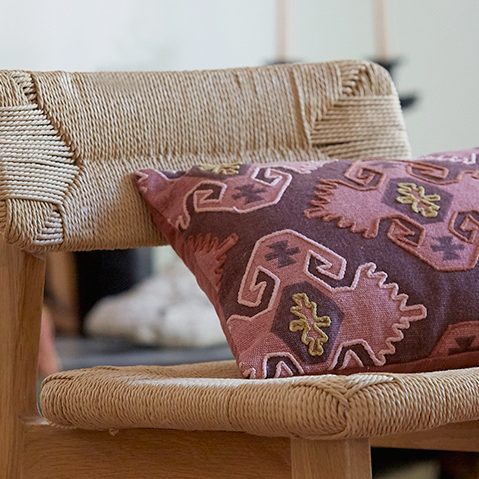 Journaliste et blogueuse déco, Laetitia Renevier nous propose une collection inspirée des maisons d’enfance. En puisant dans ses souvenirs, elle a ainsi imaginé une chambre qui mèle un esprit « maison de famille » à des pièces plus vintage, le tout parsmené d’une note de voyage. On retrouve les draps en dentelle de nos grands-mères, un chaise en corde, une coiffeuse aux lignes années 60 ou encore un coussin killim. Côté matières, le bois, la corde et le cannage sont à l’honneur, et s’associent à des textiles comme le lin, la laine mais aussi le velours.