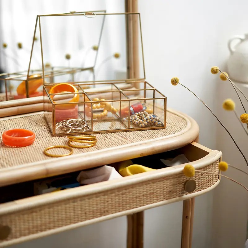 Les rangements empilables sont aussi très pratique. Il offrent une solution modulable et facile d’accès. Personnellement je les utilise pour mon matériel créatif, mais ils sont également parfait pour les jouets des enfants. Enfin, j’ai plusieurs boites en verre, compartimentées à l’intérieur. Pour ranger les bijoux mais aussi mon maquillage, je n’utilise que ca : c’est joli et tellement pratique ! Mais elles me servent aussi à classer des petits objets que j’aime : des coquillages, un dé à coudre ancien, et autres trésors inutiles…