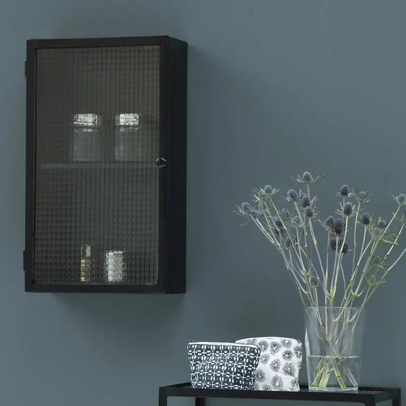 - Les meubles vitrés semi opaque (verre strié, verre armé), ou en cannage permettent d’alléger visuellement l’espace et de mettre en valeur vos jolis contenants de façon discrète