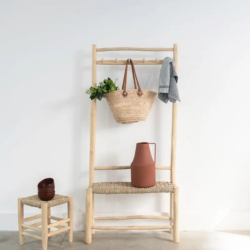 Meuble de mercerie pin massif 9 tiroirs, -63% / Banc avec portant teck et jonc de mer, -39%