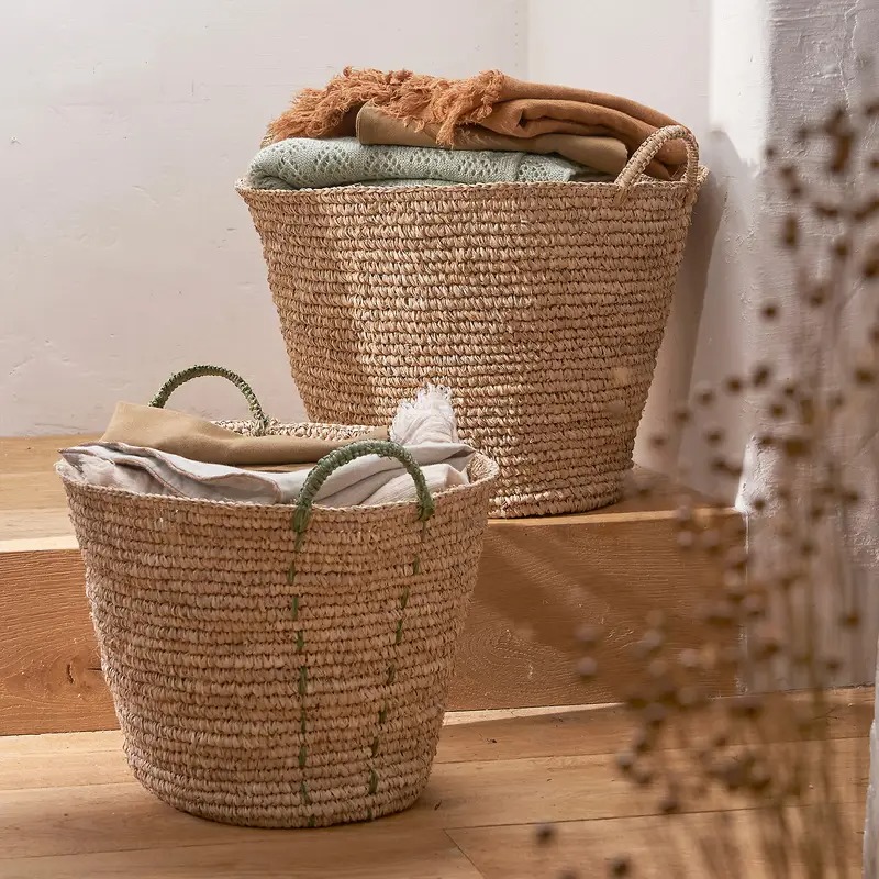 Paniers en raphia uni et poignée verte , -60% / Paniers avec anses, -35% / Panier paille de riz avec couvercle, -25%