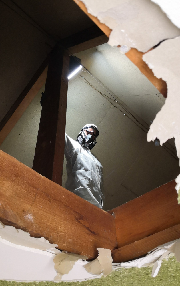 - Un masque à cartouches : Ce sont les seuls masques vraiment efficaces contre les poussières fines type laine de verre qui peuvent être irritantes. Ils permettent également de se protéger des virus contenus dans les déjections de souris par exemple, que l’humain peut contracter en respirant. L‘hantavirus reste relativement rare, une centaine de cas en moyenne en France. Mais il peut entrainer des conséquences graves. Si, comme moi, vous devez déposer et évacuer de la laine de verre colonisée par les souris, je vous invite vraiment à prendre les précautions nécessaires. Il existe des cartouches de différents niveaux de protection. J’ai opté pour du FFP3, efficace même pour les particules très fines, afin d’éviter tout risque dans la dépose de la laine de verre des rampants, en contact direct avec mes ardoises amiantées.