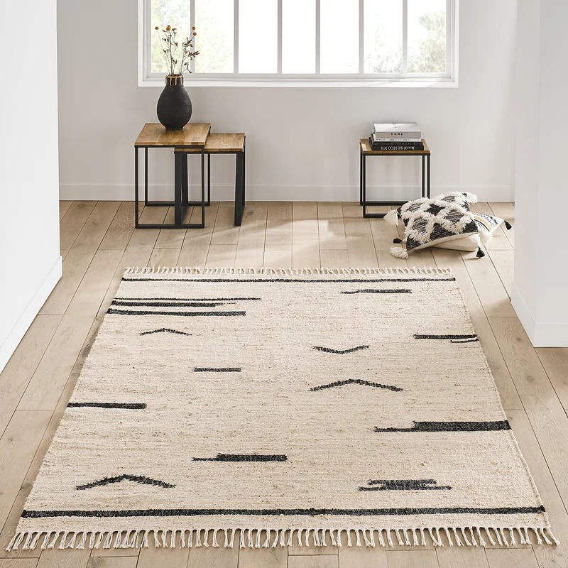 Tapis en coton motifs caramel (dispo aussi en noir), – 40% / Panier à linge rotin, -20% / Ménagère 24 couverts, -30% (dispo aussi en noir) / Tapis Kilim motifs noirs, -35% / Verres à pied vert d’eau, -30%