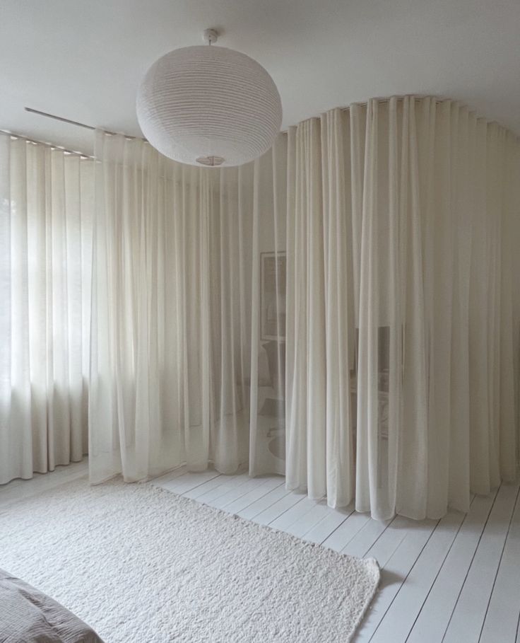 Autre solution, installez des rideaux dans la pièce, entre la fenêtre et l’espace concerné. Si vous me suivez sur Instagram, vous savez que c’est d’ailleurs ce que j’ai fait dans mon bureau. Cela fonctionne aussi avec des panneaux japonais par exemple. Cette option est facile à mettre en place et permet de moduler complètement l’espace en quelques secondes. Privilégiez les rails de plafond pour plus de discrétion. Et en choisissant des rails flexibles, vous pourrez même dessiner des courbes selon vos envies !