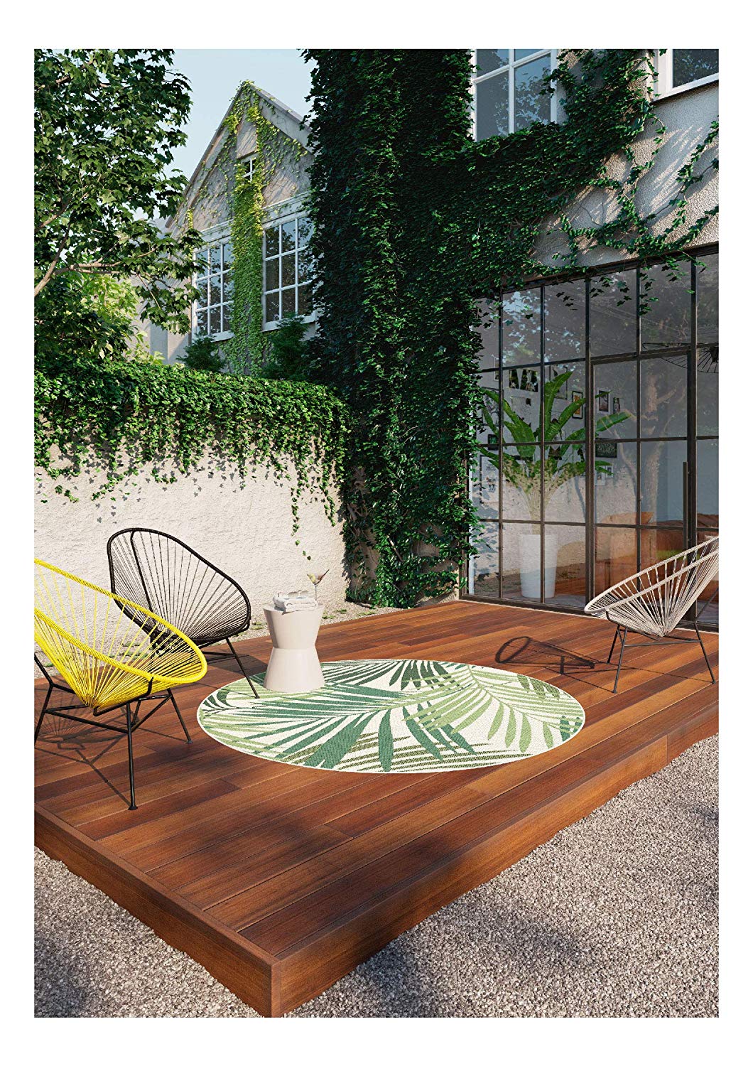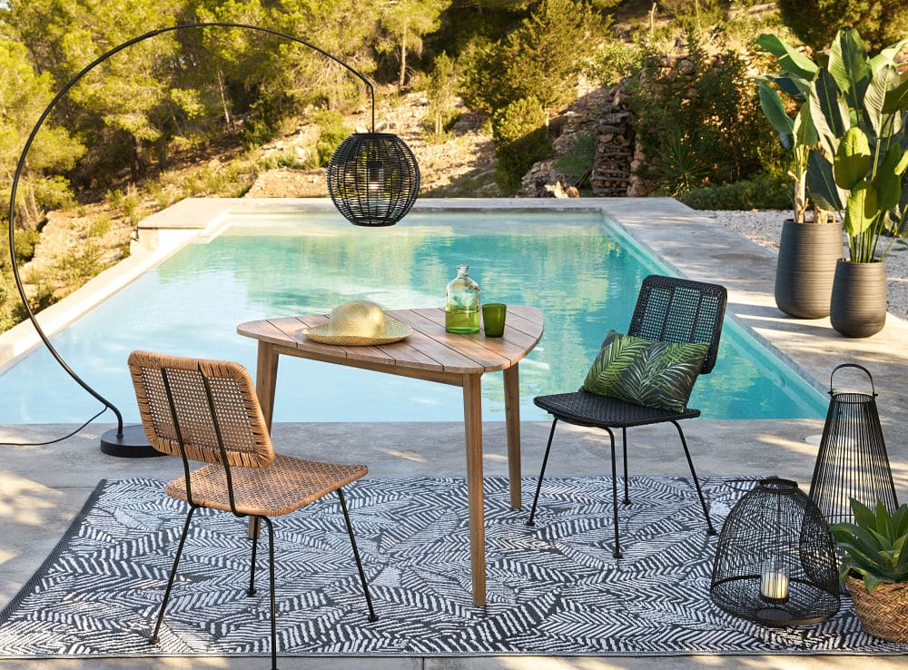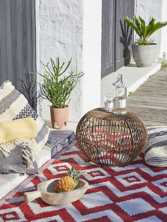 Si vous recherchez des fibres naturelles pour votre déco, Certaines matières végétales sont tout à fait compatibles avec l’extérieur. En fibre de coco, de bambou, en jute, ils sont toutefois plus fragiles face à la météo et sont donc à réserver aux endroits abrités. Mais il existe également des tapis en fibres de plastique recyclé, très résistants : une jolie deuxième vie, non ?