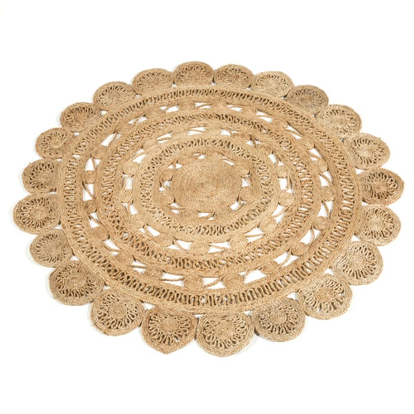 - tapis rond fleur en jute naturelle tissé main, diamètre 150cm, 99euros