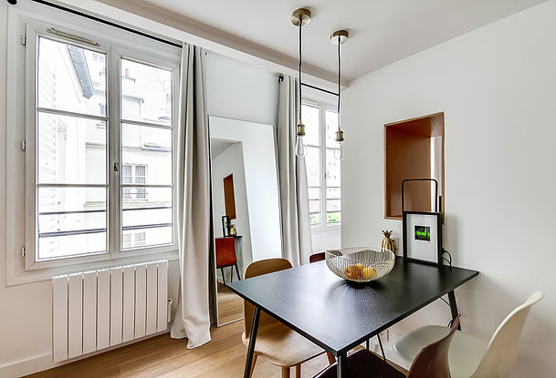 La demi cloison de placards située au centre de l’appartement est une idée lumineuse pour un petit espace comme celui ci : tout en définissant les espaces, elle laisse libre la perspective et la lumière offerte par le mur de la façade bardée de 3 grandes fenêtres, et permet d’isoler la cuisine du salon tout en offrant des rangements.