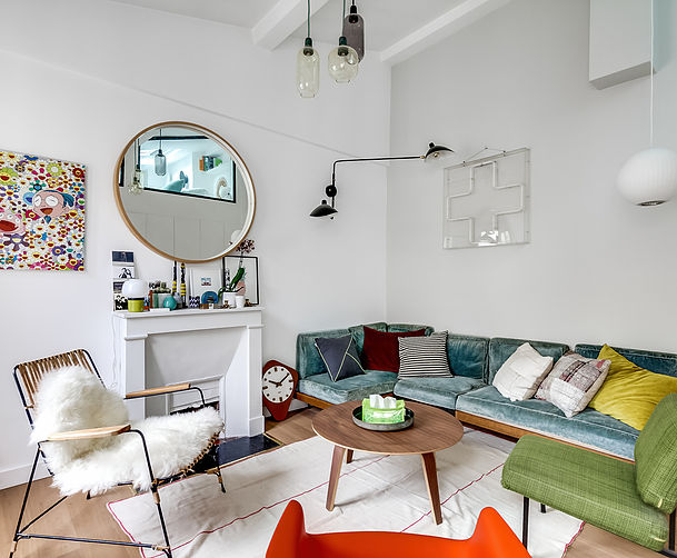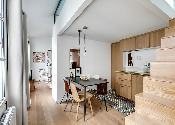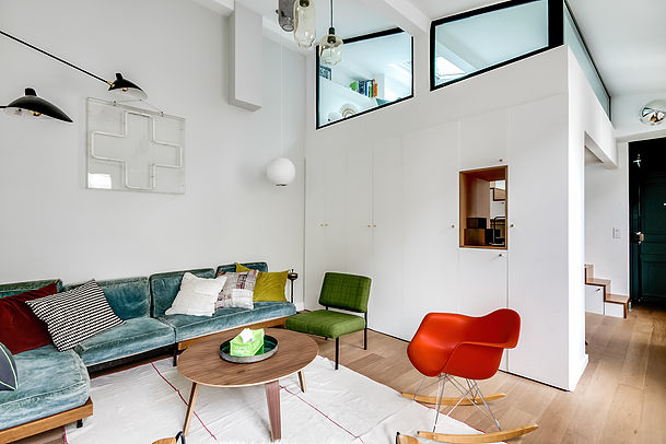 L’agence d’architecture JUNE a entièrement repensé les volumes d’un appartement parisien de 30m², dans le XVIIième arrondissement. Il y a deux semaines déjà je vous montrais un appartement sous les toits plein d’astuces pour optimiser l’espace, l’appartement d’aujourd’hui rivalise lui aussi de bonnes idées en la matière. Les architectes ont décloisonné les volumes afin de les redistribuer entièrement : une grande chambre et une toute petite pièce de vie, peu fonctionnelles, ont laissé place à une cuisine dinatoire, un grand salon, et une petite mezzanine offrant un adorable espace nuit qui a pu être aménagé en récupérant la hauteur sous plafond.