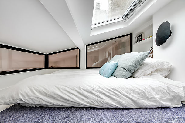 Le coin nuit est un véritable petit nid, un espace réduit entouré de vitres afin de lui donner une respiration, qui donne envie de s’y allonger pour paresser en regardant le ciel grâce au grand velux qui a été installé dans le toit.