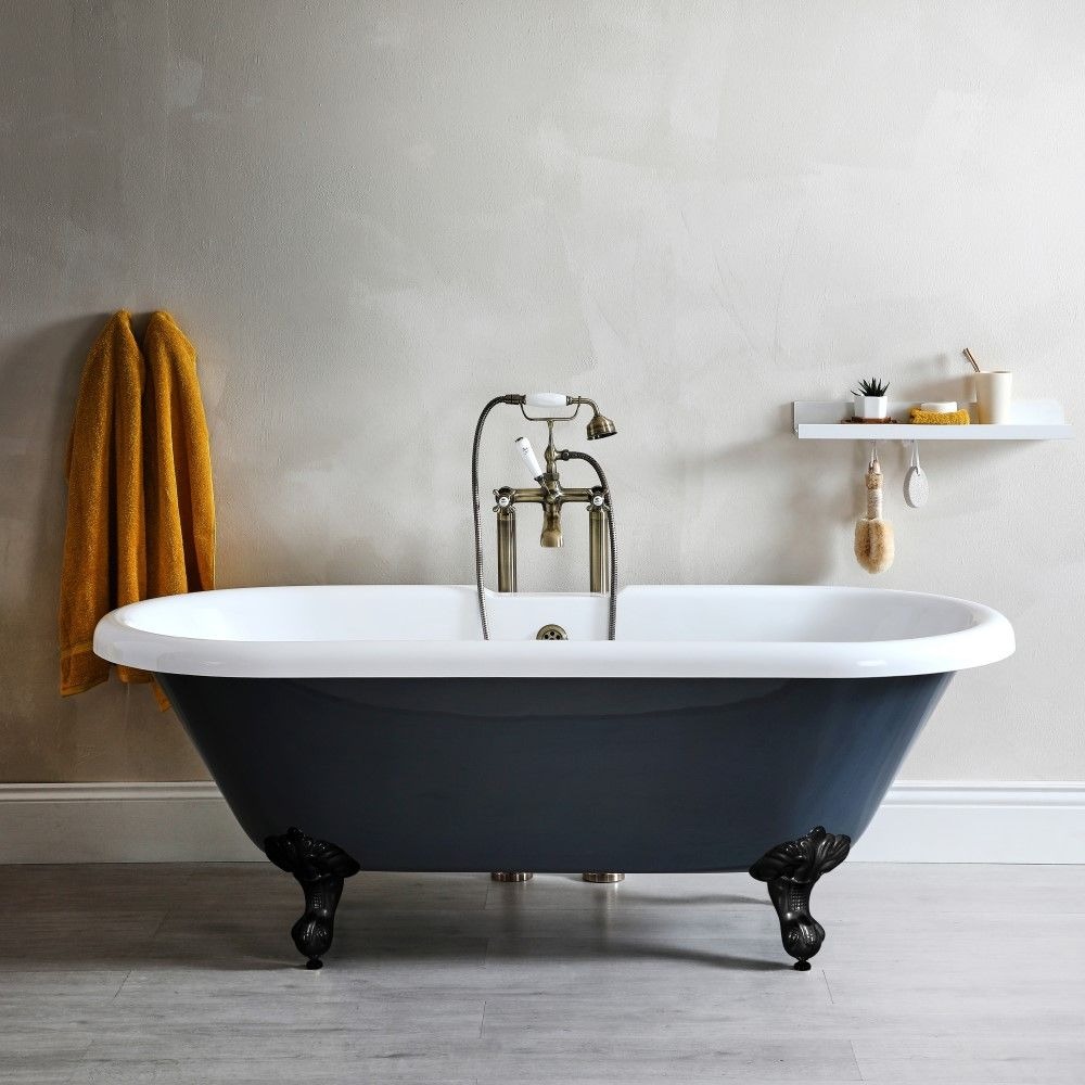 Baignoire rétro, Hudson Reed / Echelle à serviette, Bois dessus bois dessous / Tapis en jute La redoute