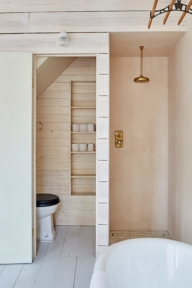 Si vous regardez bien, la majorité des couleurs sont des couleurs douces et fraiches. On trouve beaucoup de couleurs pastel ; du jaune, du bleu, du rose. Pourtant, on est loin de l’effet scandinave cheap ou mièvre ! Et ca, c’est grâce à la place laissée aux matières. Les murs recouverts de chaux affichent les belles nuances qui la caractéristique. Les meubles anciens sont patinés à souhait et les irrégularités des briques s’affirment derrière la peinture. Quant aux lasures du plafond et des murs en bois, elles laissent apparaitre son veinage. Grace à ces jeux de textures, les teintes choisies prennent ainsi une toute autre dimension.