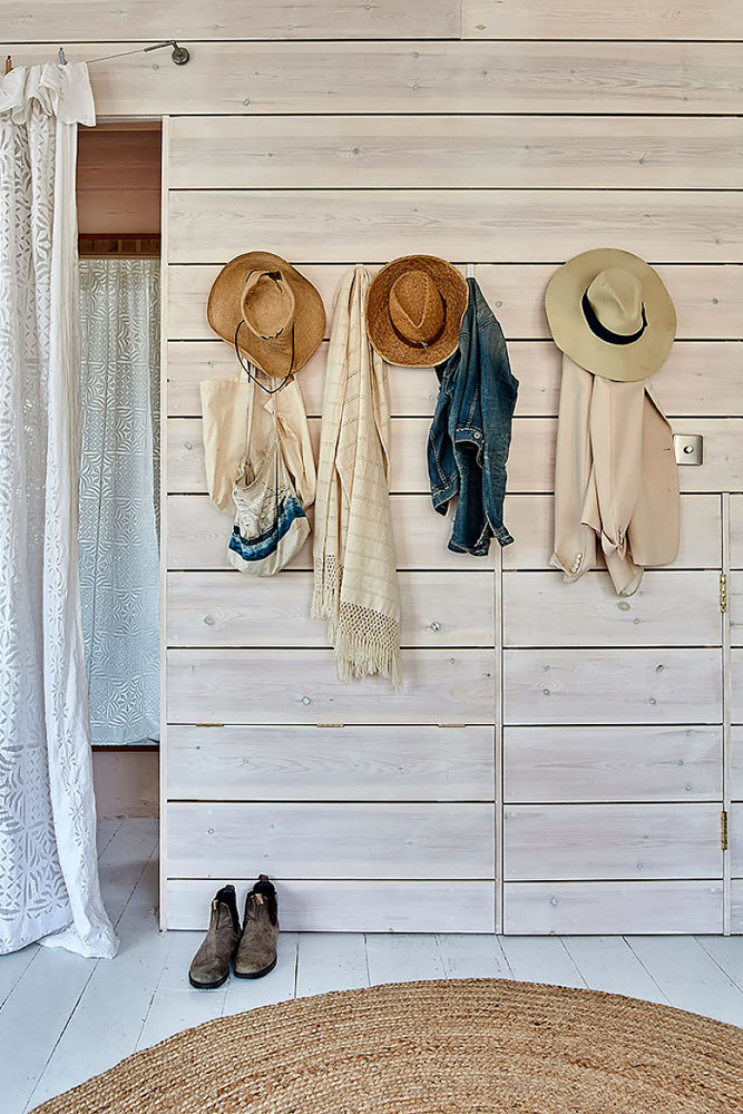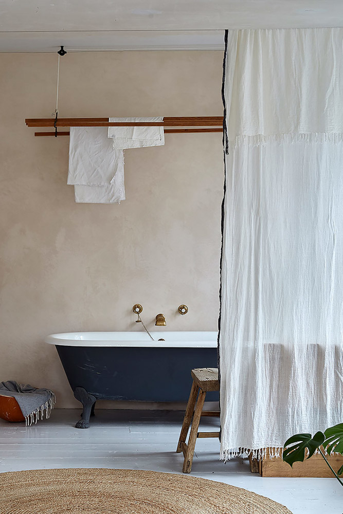 Toujours dans ce style décontracté, à la place de traditionnels rideaux, les propriétaires ont détourné de couvertures, draps anciens, et même couvre lit en dentelle. Et pour les accrocher, ils ont simplement tendu un filin en métal et ajouter des pinces. Aucune tringle ne vient ainsi alourdir l’espace. D’ailleurs, même aux fenêtres, les coupons de tissus sont simplement épinglés.