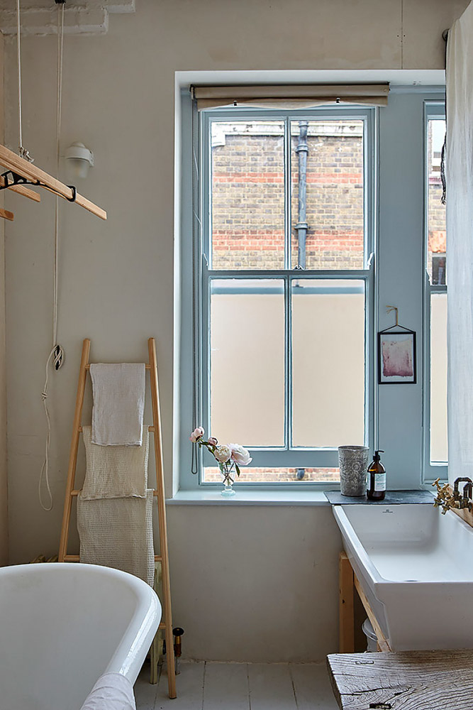 Certes, les fenêtres à guillotine et l’architecture typiquement londonienne qu’elles laissent apercevoir nous rappellent que nous somme bien dans un immeuble victorien. Mais le choix des matériaux comme des couleurs est a été fait totalement en contrepied du style cossu et classique des appartements anglais. On se croirait presque dans une petite maison de vacances au bord de la Méditerranée !