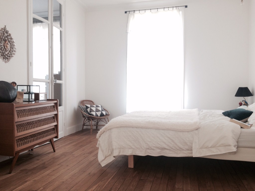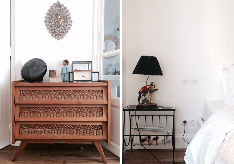 Spacieuse, la chambre, qui semble être issue de la réunion de deux pièces, s’offre le luxe d’un coin lecture avec une banquette habillée de coussins au tons poudrés. Coté lit, une jolie commode scandinave est surplombée d’un ex voto ; autre curiosité, cette lampe perroquet sur le chevet !