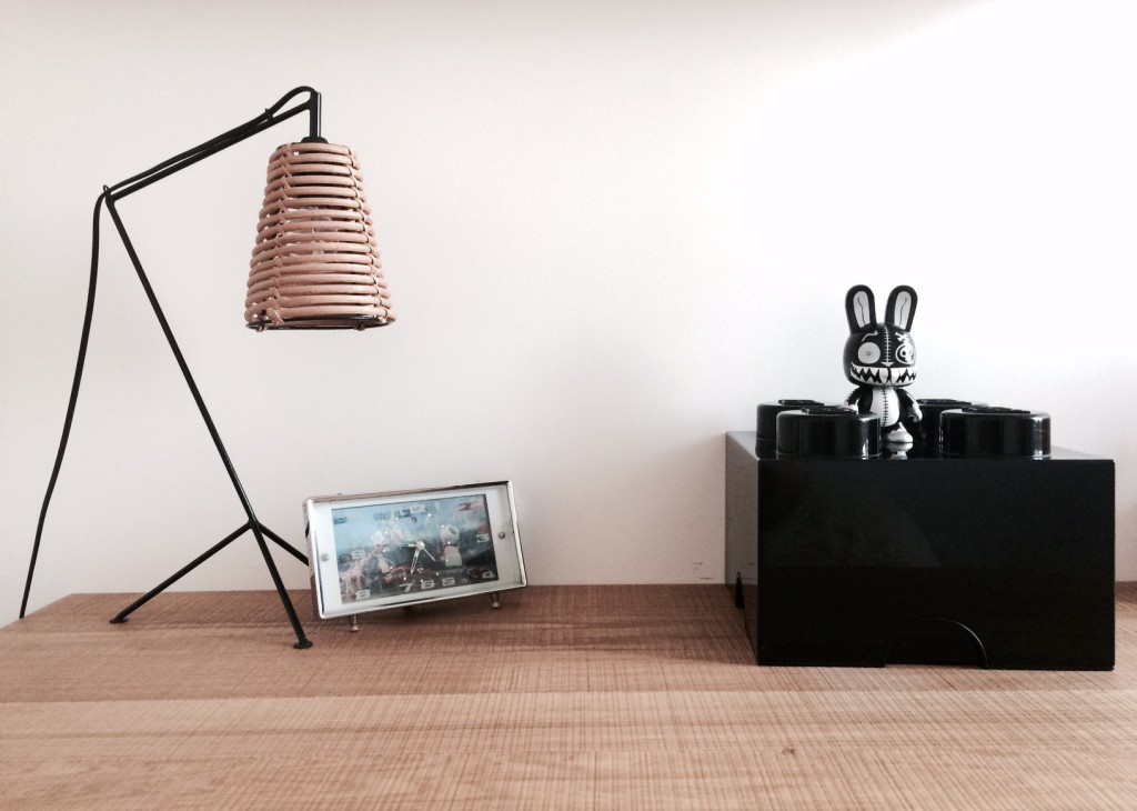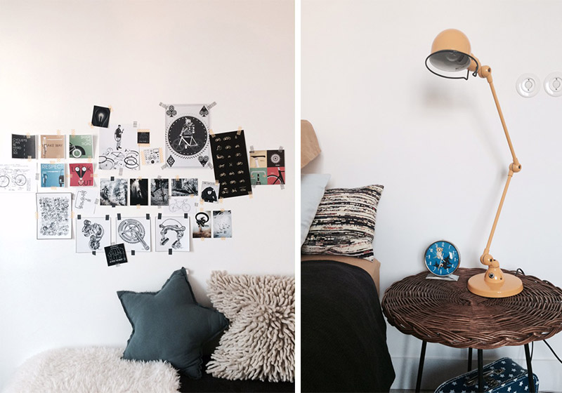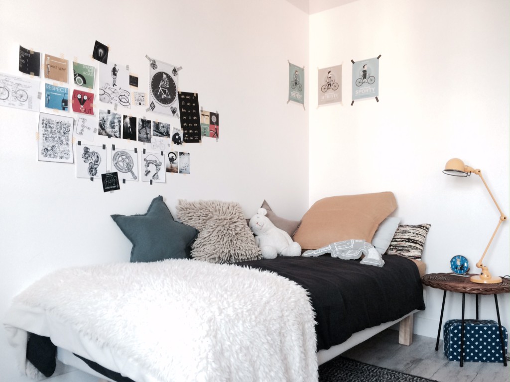 Dans la chambre de son fils, Elliot, on retrouve là encore des notes vintage avec cette table ronde en rotin qui fait office de chevet ou cette lampe moutarde de style industriel. Une peau de mouton et un pèle mêle de coussins viennent réchauffer l’ensemble.
