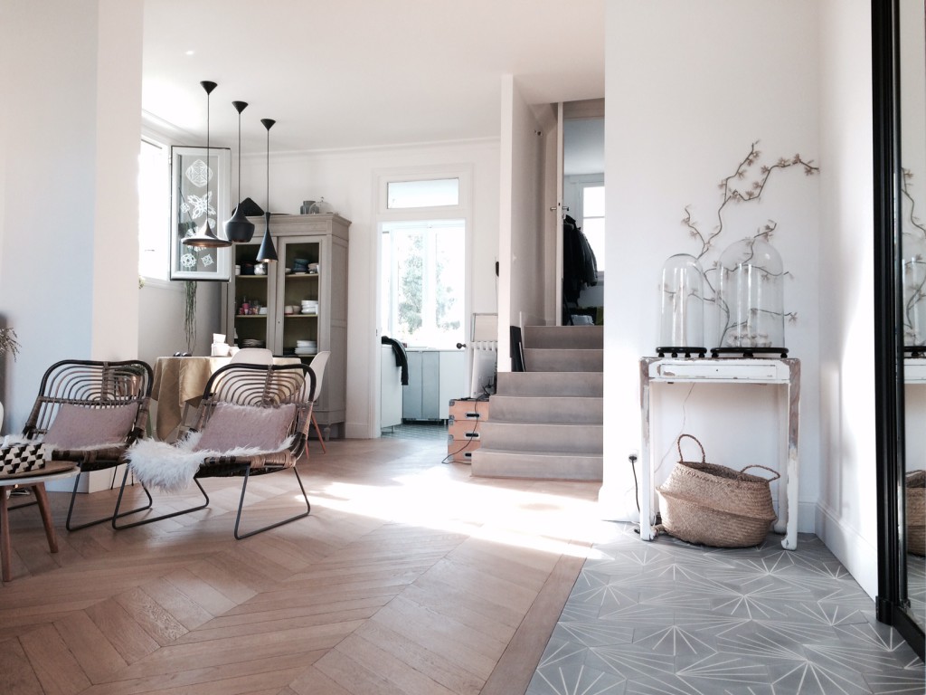 Magnifique ! J’adore le parquet chevron et le carrelage gris très élégant… La salle de baiiiin !!!