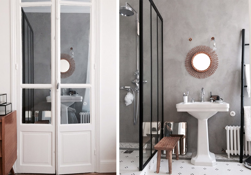 Une grande porte vitrée ancienne s’ouvre directement sur la salle de bain : des murs béton, une cloison de douche façon verrière industrielle, un évier ancien et un joli miroir en rotin, la salle de bain a été aménagée avec beaucoup de goût !